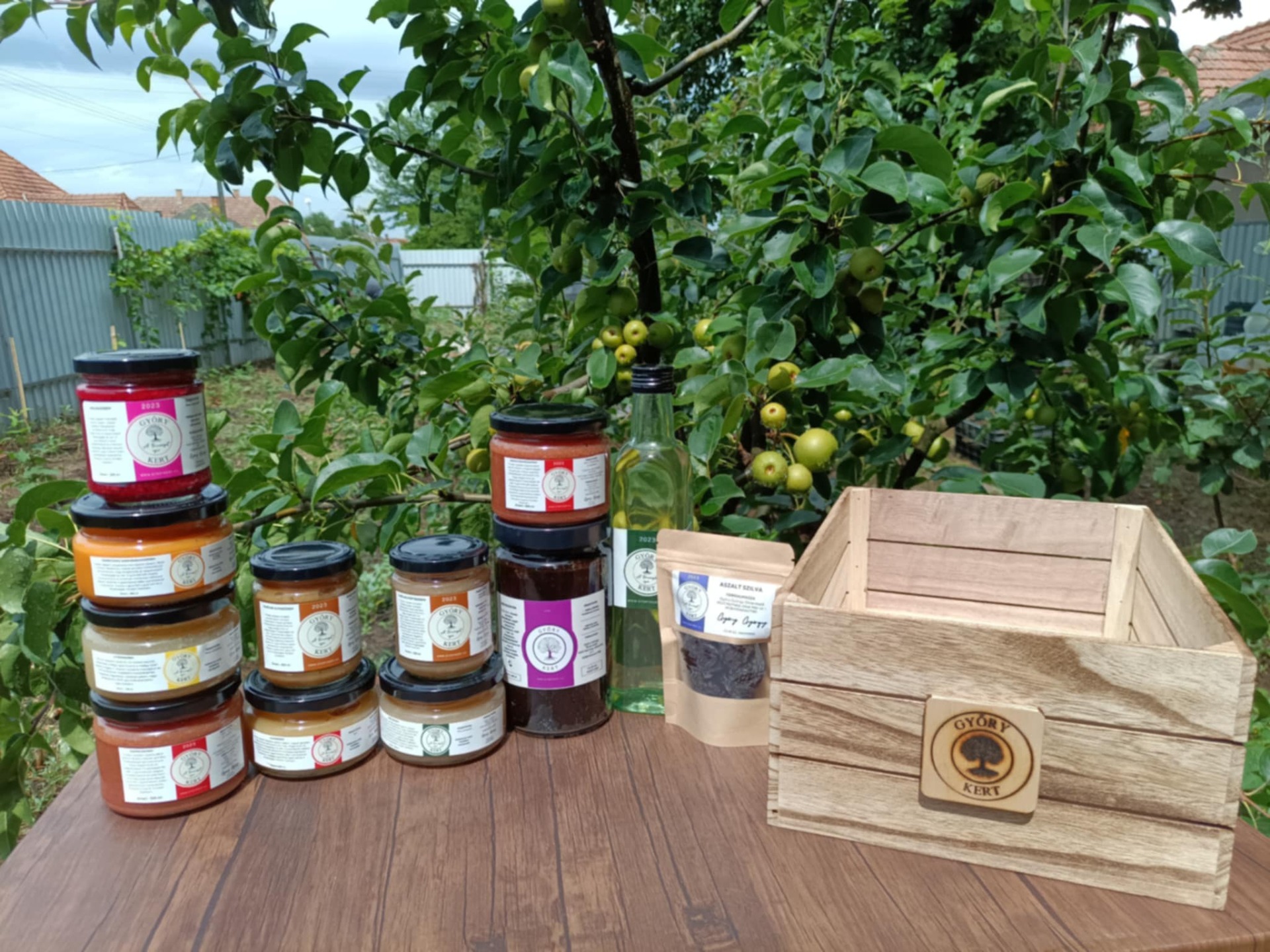Győry Kert Prémium Ízkosár – A természet zamata egy fadobozban Fedezd fel a Győry Kert varázslatos ízvilágát ezzel a gondosan összeállított termékcsomaggal, amely egy exkluzív, egyedi GyőryKertes fadobozban érkezik hozzád. A csomag a kert legfinomabb gyümölcseiből készült lekvárok, dzsemek, szörpök és aszalványok különleges válogatása – mind kézműves minőségben, adalékanyagok nélkül, szeretettel elkészítve. A doboz tartalma: Máladzsem (250 ml) – Krémes málnaélmény, mely bármilyen reggelit ünneppé varázsol. Fehércsokis sárgabarack dzsem (250 ml) – A bársonyos fehércsoki és a zamatos sárgabarack szenzációs párosa. Citromdzsem (250 ml) – Friss, pikáns és különleges – igazi ínyenceknek. Szamóda (320 ml) – Klasszikus szamóca dzsem, pont úgy, ahogy gyerekkorunkból emlékszünk rá. Fahéjas alma dzsem (250 ml) – Az őszi fűszerek meleg ölelése minden kanálban. Fahéjas körte dzsem (250 ml) – Illatos, lágy és édesen fűszeres. Alma dzsem (250 ml) – Egyszerű és természetes, mint maga a frissen szedett gyümölcs. Körte dzsem (250 ml) – Lédús és telt íz, mintha egyenesen a fa alól kóstolnád. Mézes szamóca (320 ml) – Szamóca, egy kis mézes csavarral – természetes édesség. Szilvalekvár (580 ml) – Klasszikus házi ízek, sűrűn, tartalmasan – pont, ahogy a nagymama készítette. Bodzaszörp (500 ml) – Virágos, üdítő és harmonikus – tökéletes frissítő a melegebb napokra. Aszalt szilva (100 g) – Természetes nassolnivaló, tele rosttal és ízzel. Tökéletes ajándék vagy különleges élmény saját magadnak A Győry Kert Prémium Ízkosár ideális választás, ha valami igazán különlegeset keresel – legyen szó ajándékról, vendégvárásról vagy csak egy nyugodt reggelről egy finom lekváros pirítóssal. Minden termék mögött a természet és a kézműves gondoskodás áll – érezd az ízekben a törődést!